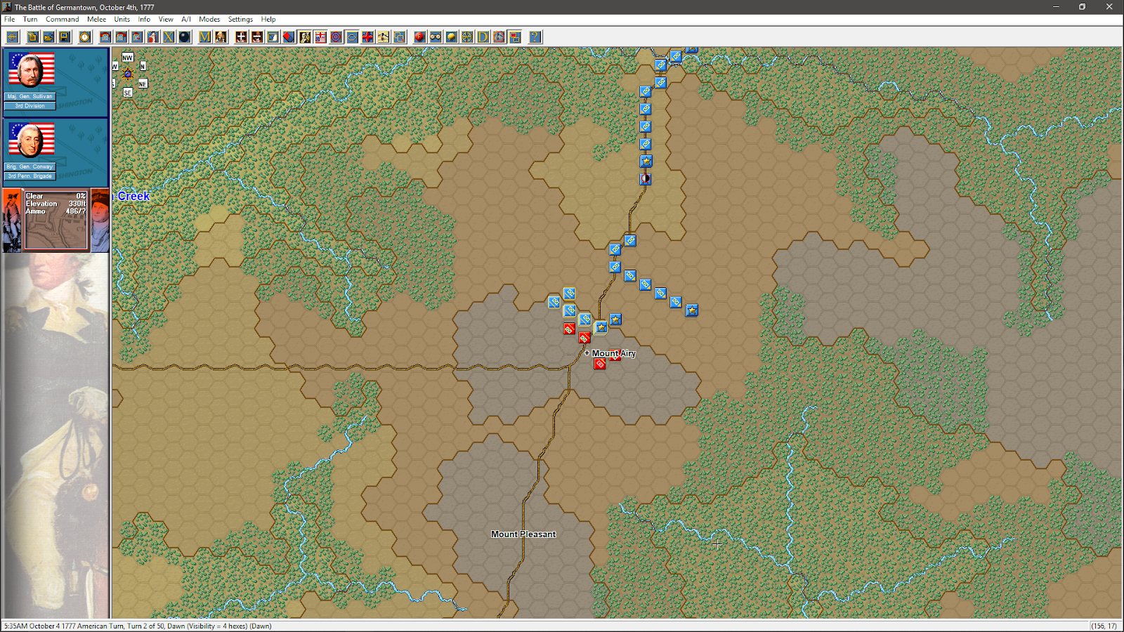 Conway's Pennsylvania brigade deploying versus light infantry and artillery at Mount Airy, as Sullivan's division begins their advance on Germantown.